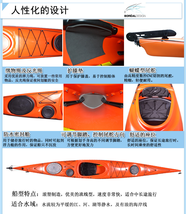 Boreal Design皮划艇来自加拿大风光秀丽的魁北克市,创建于1991年,已经有20多年的海洋舟制造经验。其制作工艺及质量深受全世界皮划艇使用者的好评。精湛的制作工艺使每一艘从Broeal Design工厂生产出来的海洋舟都能在保证坚固性的同时,又保持韧性;外观优美时尚,对细节精益求精,堪称海洋舟中的艺术品。能拥有一艘Broeal Design海洋舟是许多划手梦寐以求的骄傲。拥有Broeal Design独木舟,是划手面对极端环境信心的保证。在下面的介绍当中,你将会看到对于Broeal Design各种艇型的详细参数及特点描述。帮助您更加自信勇敢地划行于河流、湖泊与大海,去享受我们美丽的蓝色星球。